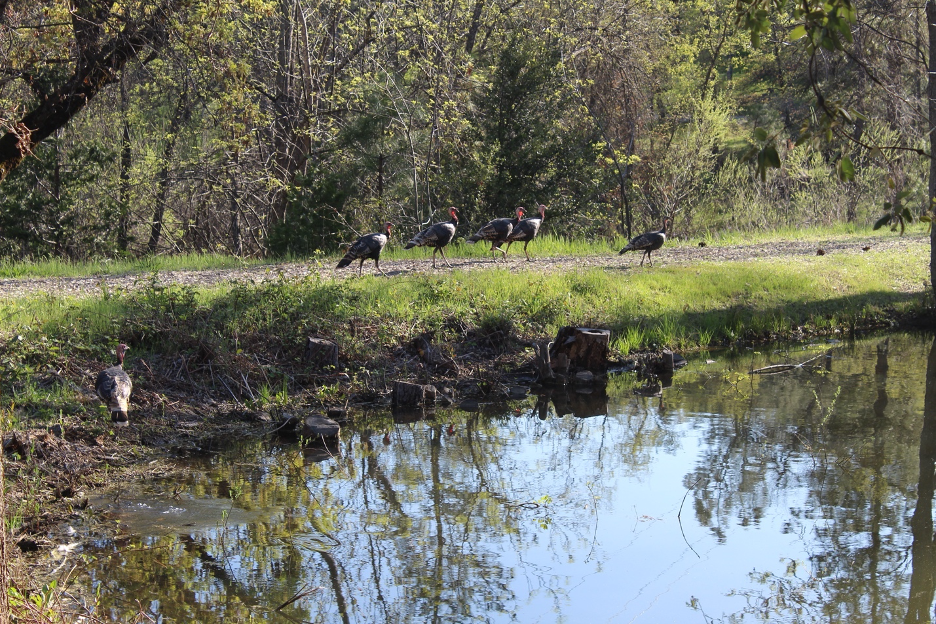 Wild turkeys are particularly entertaining as they dive out of their trees (where they roost at night to avoid predators) early in the morning and trot around during the day. Their toe-walking and dragging one foot in front of the other leaves an arrowhead-like trail. Turkeys are not native to California, but numerous attempts to introduce them finally became successful so that their numbers multiplied since the 1960s until they now total about 250,000 in the state. These omnivores mate and lay their eggs during spring. Gestation takes about a month and they are most vulnerable to predators (such as coyote, bobcats, foxes, some birds, and domesticated animals) after hatching. Adults may become nuisances around humans as they show aggression with their flapping and pecking; their droppings also get pretty messy. They’ve been known to damage gardens and attack their reflections in windows and on the sides of cars.