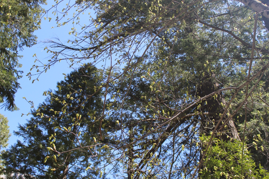 Deciduous trees such as bigleaf maple are just starting to bud in April. Taller conifers are seen in the background, as they point toward the morning’s crystal blue sky, perhaps to demonstrate the diverse mix of species common to healthy woodlands and forests.