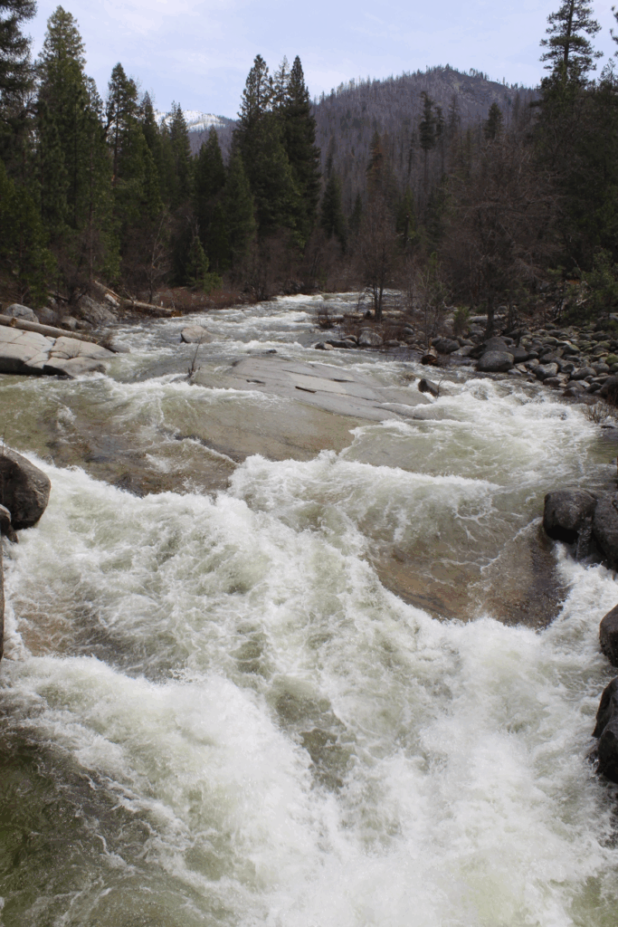 The trail to the bridge along the South Fork of the Merced River (designated a wild and scenic river as it flows out of the high country) offers opportunities to compare recovery after two fires. The 2017 fire (near the height of the megadrought, bark beetle infestations, and millions of Sierra Nevada tree mortalities) burned south-facing slopes to our left, across the river; later, the 2022 fire burned north-facing slopes to the right of the trail. What a great location to research how slope aspect influences light and heat exposure, which helps determine the rate of regrowth following two different fires from eight and three years ago. There is a popular swimming hole here, but the water and weather are still far too cold to test the swirling whitewater. This section of the river also experiences enormous variations in discharge that have ranged from 2.15 cubic feet per second (July 2014) to more than 1,000 cfs during spring runoff periods. (A cubic foot is about the same volume as a basketball filled with water.) It is also a good place to review how discharge is estimated by measuring the average cross sectional area of the stream and then multiplying it by the average water velocity of water across the stream (Q = A x V). NOAA has operated a stream gauge just downstream from our location. You can find the most recent stream stage at this site.