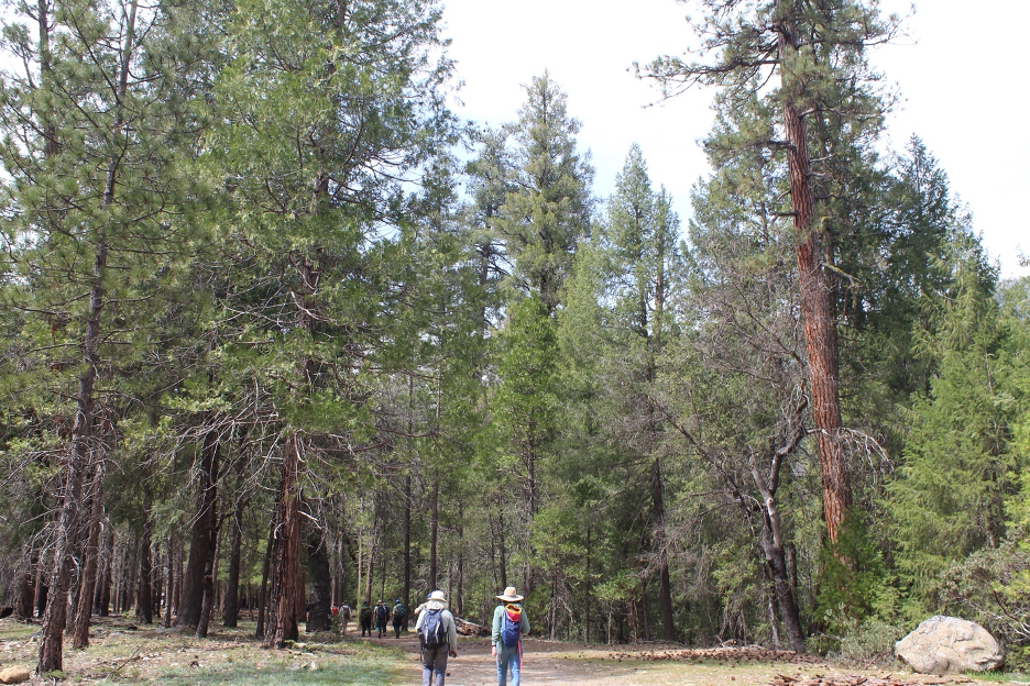 We pull of off Hwy 41 near the little general store on Forest Drive. We continue to the end of the road, where we eat our lunch on a big log and then set out on the Wawona Swinging Bridge Trail. During our walk to the bridge, Chris Cameron summarizes the essentials of weathering and decomposition that produce soil profiles. He emphasizes the importance of FBI (fungi, bacteria, and invertebrates). We poke and prod through the most fundamental soil profiles starting at the surface: litter, duff, humus, topsoil, subsoil, and finally bedrock at the bottom. A loud Steller’s jay rummages into the soil profile and calls out to remind us how these aggressive scavengers help disperse seeds that sprout to become new plants in a healthy forest. These omnivores with their beautiful feathers that reflect blue light are smart enough to mimic sounds that include other animals.