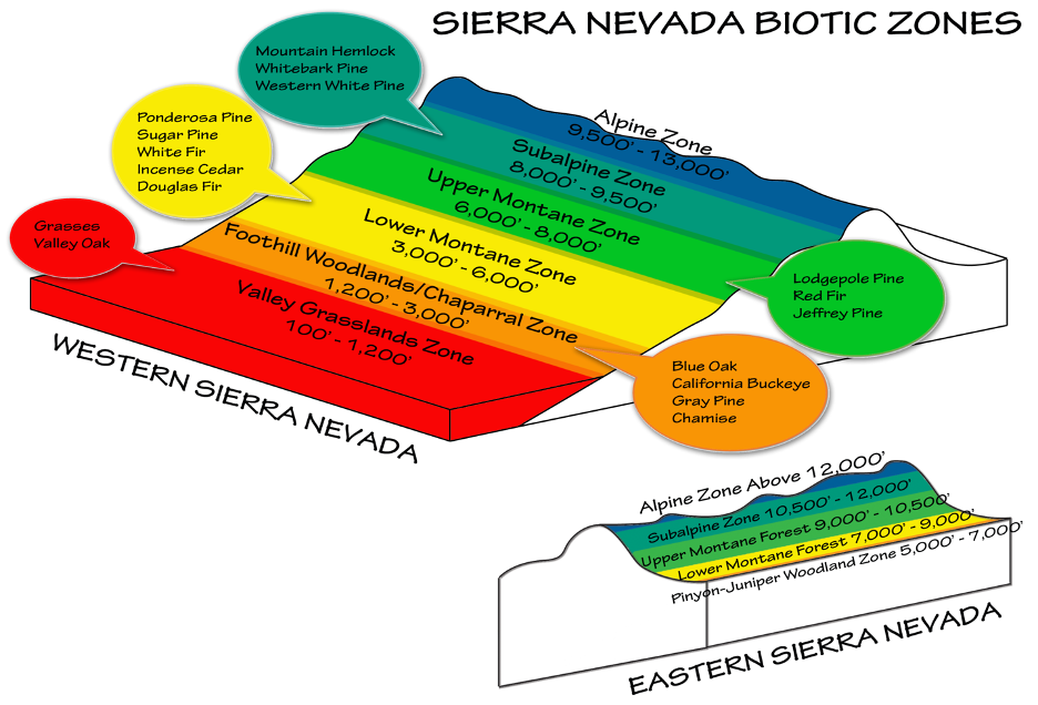 Shirley then dives into her discussion, recognizing the uniqueness of the California Floristic Province and asking what makes the Sierra Nevada so special: proximity to the Pacific Ocean, elevation gradients, and latitude. This launches us into a survey of Sierra Nevada’s vegetation zones, which are similar to the life zones we have highlighted on this website and in my book. (I also wandered into them on the first page covering my first day of this story.) Here is a good diagram from Reflections of the Natural World by Jim Gain.