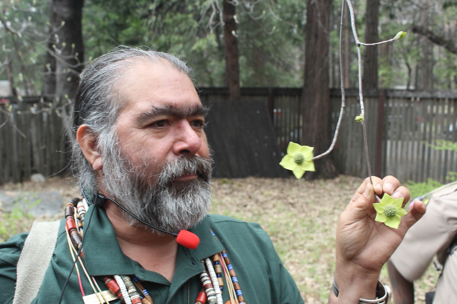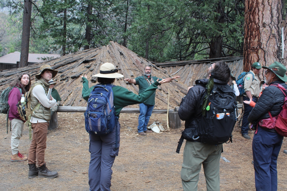 We meet at the Yosemite Museum, which is the primary Native American Museum in Yosemite. Visitors learn about the Ahwahneechee people who lived in the valley, and the Miwok and Paiute people, who lived in surrounding regions. There is a re-created Indian Village in the back of the museum. Here is also where we meet Ranger Ben Cunningham-Summerfield. In that spirit of “nothing about us without us”, Ranger Ben shares some of his traditional ecological knowledge and research, passed down by the Miwok and Piute people who lived in this region for thousands of years.