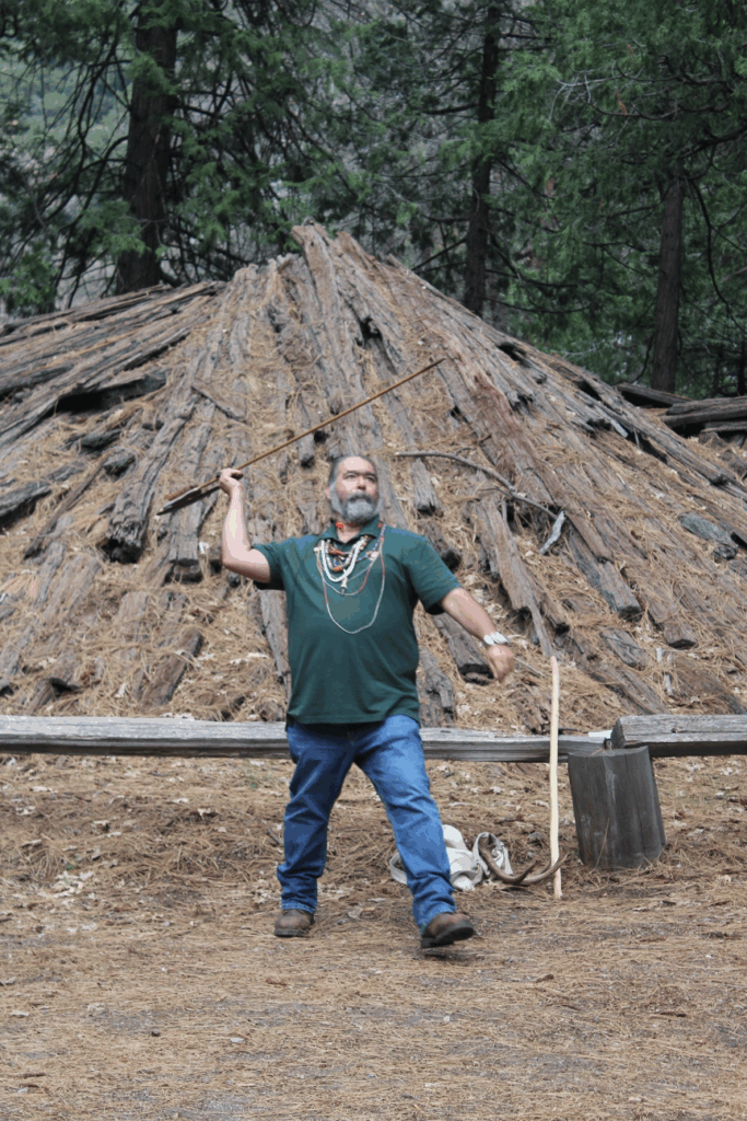 Plants on display at the demonstration village range from the foothills to higher elevations; each species has specific uses that helped sustain these hunter-gatherer cultures. Note that, except for along the Colorado River, California Native Americans didn’t practice agriculture, probably because it wasn’t necessary for their survival. But they did encourage, nurture, and manipulate particular species and plant communities that they found most valuable. Native plants were used as insect repellants, sinus cleaners, stew pots, and acorn stores (known as “chukahs” or granaries). Soap root is a bulb in the yucca family that was baked to eat and also used to make pastes and glues. Acorns from various oak species (such as black oak, blue oak, canyon live oak, and interior live oak) were ground up into a flower and leached (to remove bitter tannins) as vital staple foods. In foothill communities at lower elevations, California buckeye was cooked and processed similar to acorns. This classic film shows how a Nisenan woman prepared buckeye. Leaves and berries of the creeping snowberry were harvested for food and medicines. Parts of creek dogwood were used to make baskets, dyes, and medicines. The flexible half of cedar limbs were used to make bows and arrows. Ranger Ben then demonstrated (with impressive accuracy) how the Miwok hunted with atlatls (spear throwers).