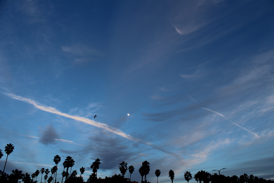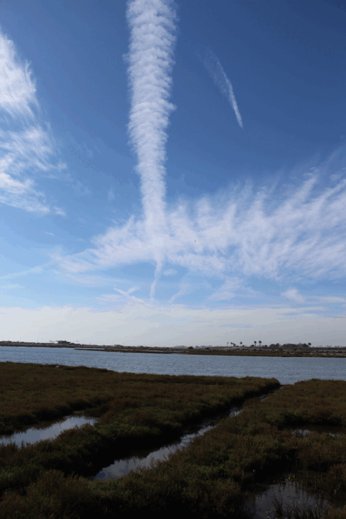 Contrails form and merge with ice-crystal cirrus in a nearly saturated atmosphere above around 25,000 feet. This is looking over Bolsa Chica Wetlands near Sunset Beach at sunset.