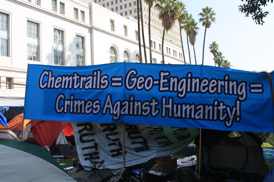 We can start with more than a decade of very public statements and events that finally inspired this story. My first big wakeup call came around 2011, while wandering into one of those Occupy Wall Street encampments at City Hall; I noticed a giant “Chemtrails=Geoengineering=Crimes Against Humanity” banner draped across the plaza. When I extended my hand and politely quizzed the protagonist about his sign, he asked me why I was bothering to explain the science for him and then he walked away in frustration. While radio-channel surfing several years ago, I chanced upon a DJ on a famously progressive-leaning all-news station asking for donations during a pledge drive. She was ranting about how chemtrails were so prevalent one day and absent on others, proving that some sort of secret government program was responsible for spraying our skies with poisonous chemicals that were changing our weather and how their investigative reporters were getting to the bottom of it all. Then there was the popular local TV news anchor who went on a special assignment interviewing people who believed that their health problems only flared up when those mysterious chemtrails appeared overhead above 25,000 feet. That perspective earned a series of prime-time TV stories shamelessly designed to boost network ratings.
