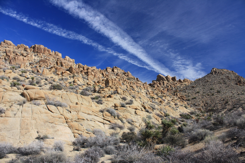 Contrails appeared to be mimicking the trend of granitic rock formations and topography here in Joshua Tree National Park.