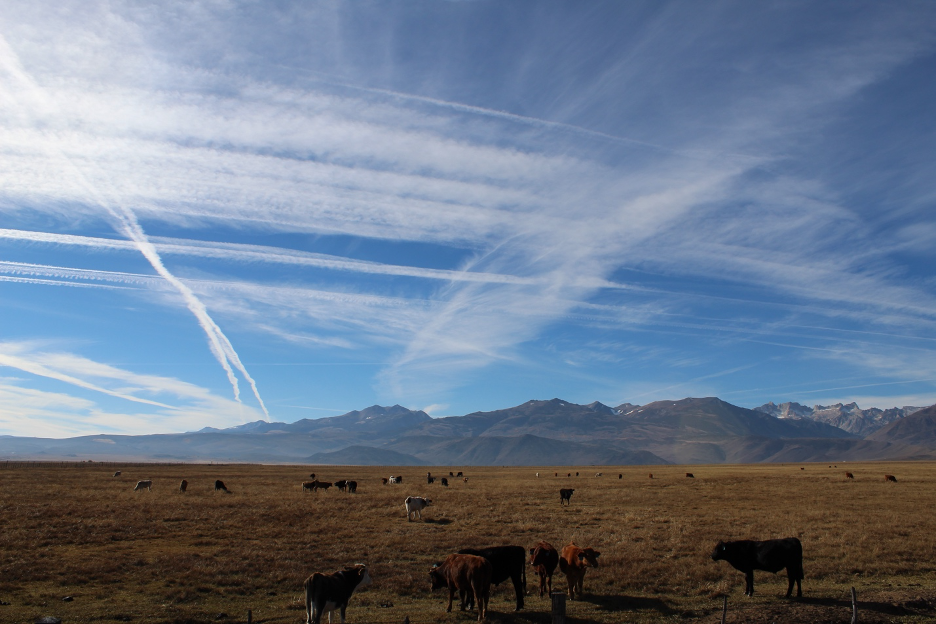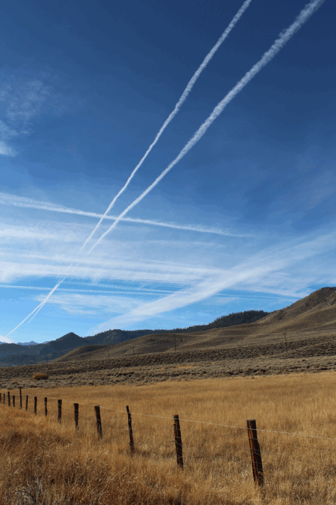 On this autumn day, some contrails seemed to form parallel to these barbed-wire fences and distant power lines east of the Sierra Nevada.