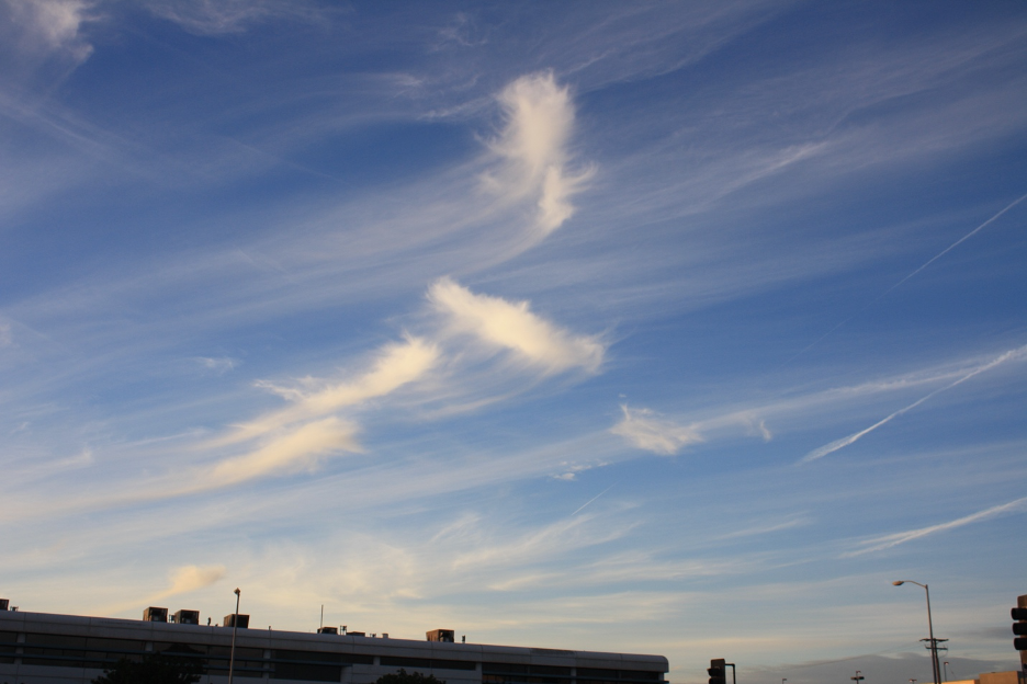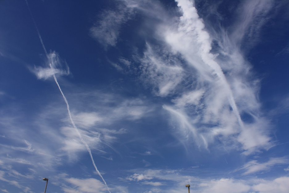 Streaks of high ice-crystal cirrus clouds stream ahead of an approaching warm front. Moistening upper layers set the stage for contrails to add some streaks as jets pass through.