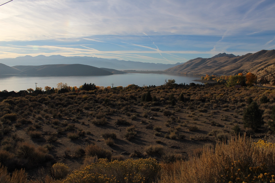 Fall colors, cirrostratus clouds, and contrails decorate this autumn scene over Topaz Lake on the California/Nevada Border.