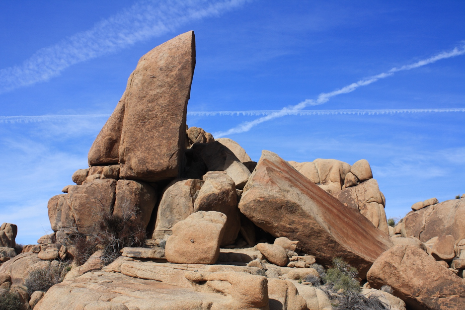 Weathering granitic rocks at Joshua Tree National Park point toward crisscrossing contrails.