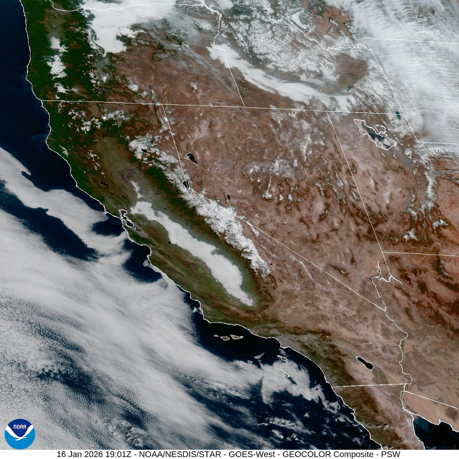 A prolonged dry pattern has been established for nearly two weeks by January 16, 2026. Sierra Nevada snowpacks were melting away and stubborn Central Valley fog is struggling under the midday sun. High pressure is in charge here. Afternoon temperatures would soar into the 80s for several January days throughout Southern California. Source: NOAA/National Weather Service.