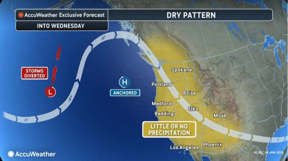 This dry ridging pattern dominated over the West Coast through most of January, 2026. Source: AccuWeather.