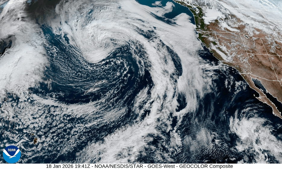 This satellite photo shows the same November 15, 2025 storm spinning precipitation into Southern and Central California. Notice the long connection to the tropics as the atmospheric river races across the Pacific (from the bottom of the screen) and is directed toward the West Coast. Source: NOAA/National Weather Service.