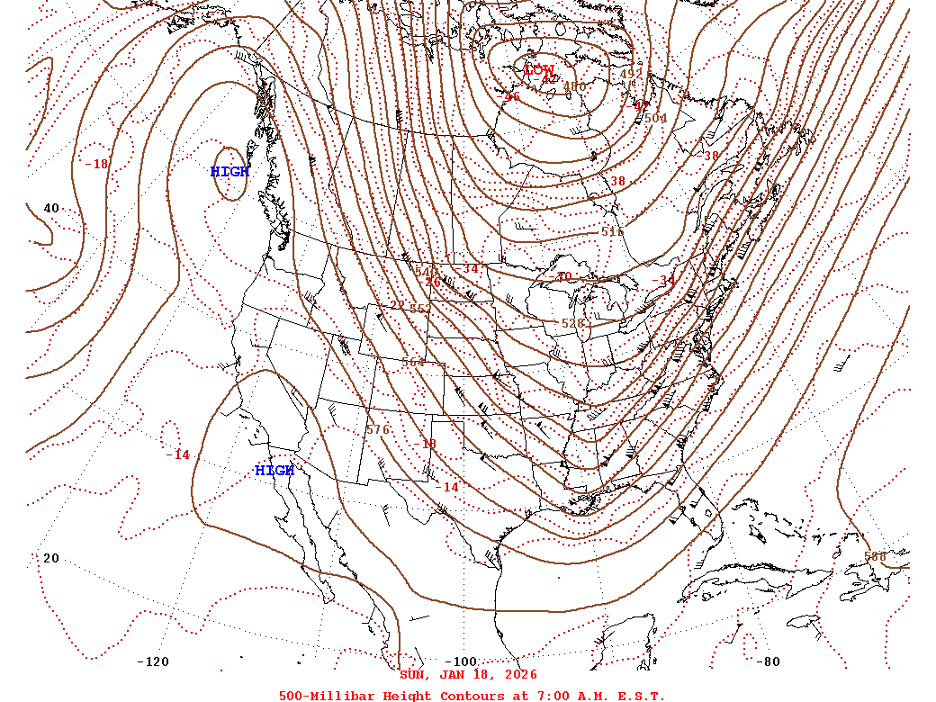 This 500mb chart rom January 18 shows the amplified West Coast fair-weather ridge adjacent to the historic cold arctic trough to the east. Follow the contours and winds that flow out of the Arctic, then deep into the southern US. Similar upper-level patterns remained nearly stuck in place through the end of January.