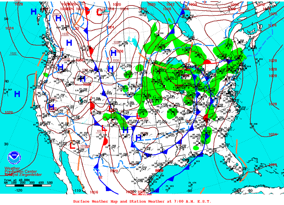 By the next day (January 26), the monster front slumped south across southern Florida and the southern Gulf of Mexico and into the Atlantic Ocean. Extensive areas of reflective snow and ice were left behind across the Midwest and Northeast, along with a prolonged period of bitter cold temperatures all the way into Florida and the Gulf States. Note how most of California and the Southwest remain under fair weather high pressure, except for the patches of typical winter valley fog. Source: NOAA/National Weather Service.