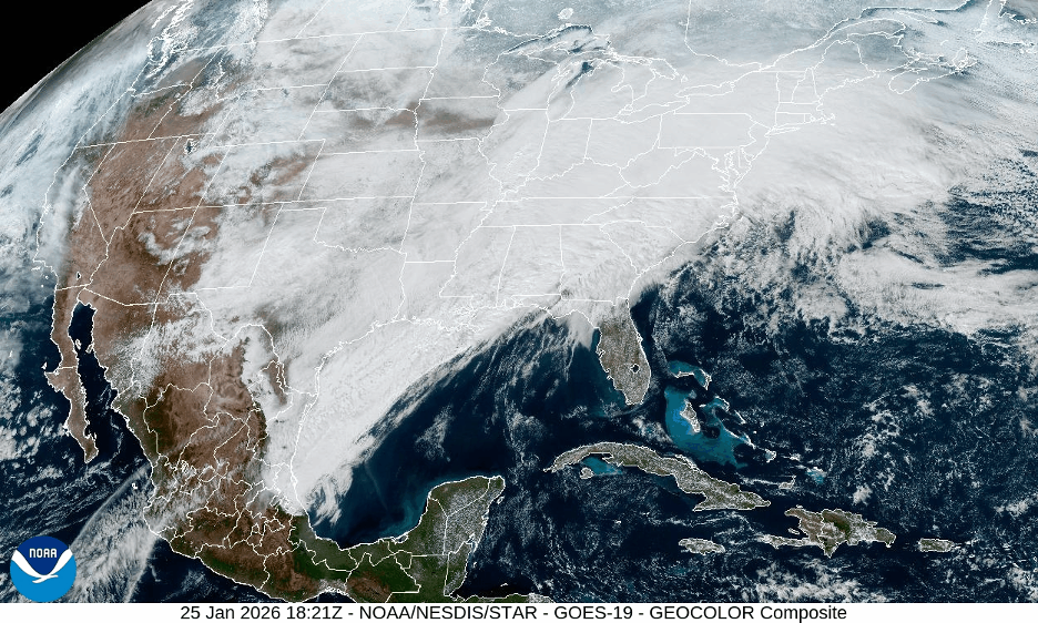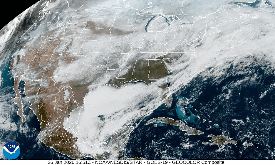 Follow the moisture as it streams from southwest to northeast (lower left to upper right) from the Pacific Ocean, across Mexico and the Gulf of Mexico, and then all the way to the northeastern US. The warm, moist air is gliding up and over an extensive frontal boundary as it encounters extremely cold air racing south from Canada. This monumental airmass battleground grew deadlier as it wreaked havoc across about two-thirds of the US. By contrast, note the clear patches signaling fair weather beneath our blocking West Coast high-pressure ridge. Source: NOAA/National Weather Service.