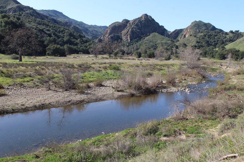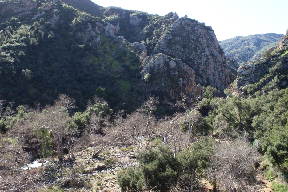 Malibu Creek slices through Conejo Volcanics rocks at Malibu Creek State Park in early February, 2026. Dormant deciduous trees (such as sycamore) lining this riparian woodland and some surrounding valley oaks are evidence that this is a mid-winter scene, except it’s another in a long string of sunny days with afternoon temperatures soaring into the 80s.